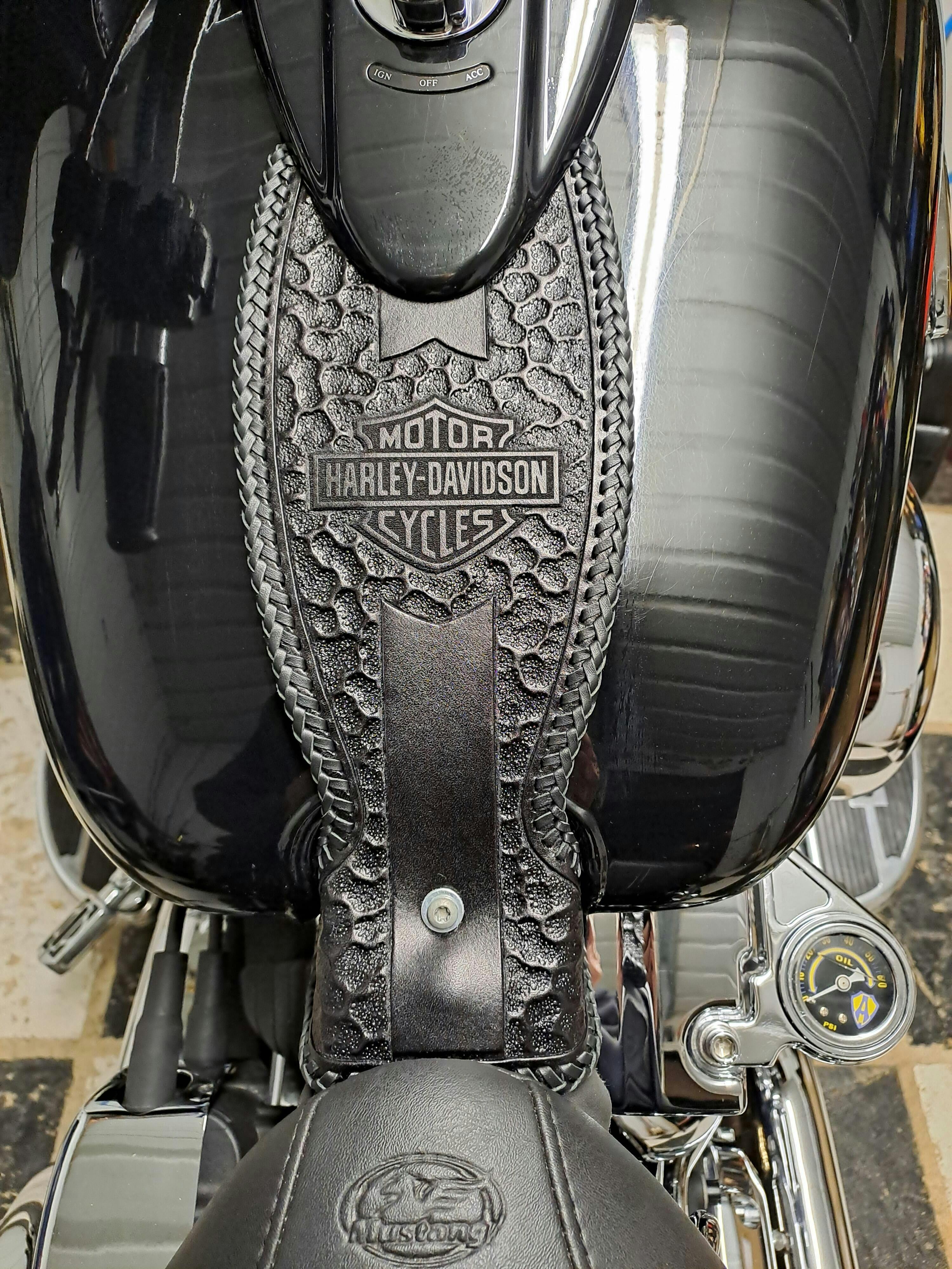 I ordered a tank bib with hand braided edges and center crossed leather strand accents. This was the slim style but for Tina heritage. Chris took my desires from a conversation over the phone and turned out an awesome custom piece. Please have patience, he’s a one man operation. Well worth the wait!!! 5 stars