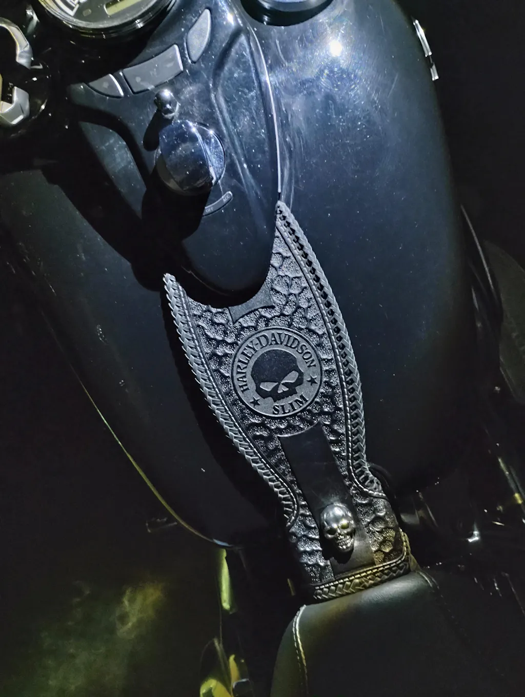 One of the most unique designs you'll find anywhere. The Chaos Pebbles pattern is  freehand tooled on a single layer of Hermann Oak 7oz. saddlery leather with the laser engraved Slim edition logo in the center. Each bib is like a fingerprint, no two are the exactly same! Smooth black rolled edges or hand braided edges finish it off for a factory custom look.